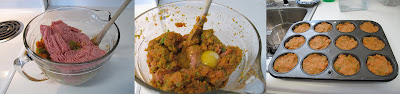 Mix vegetables with ground turkey and egg. Fill greased muffin tins with mixture.